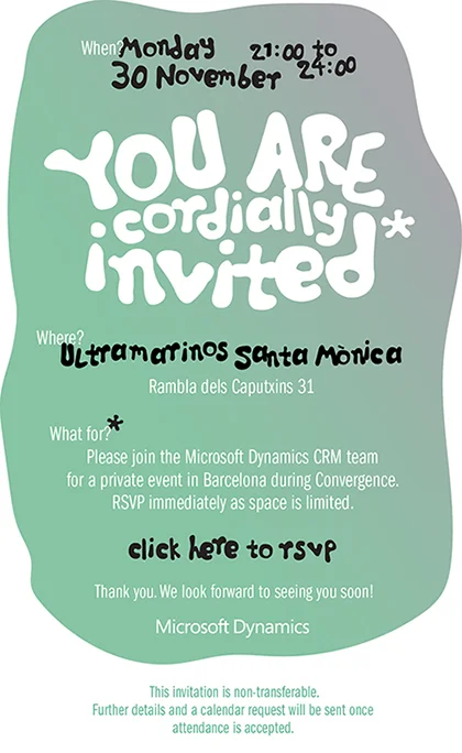 When attending an exposition with over 12,000 Microsoft Dynamics' users, it's special to be one of the few invited to a private dinner with the hosting Microsoft team. These year-after-yearn eblast invitations combine the flavor of Barcelona with a taste of each individual restaurant.
